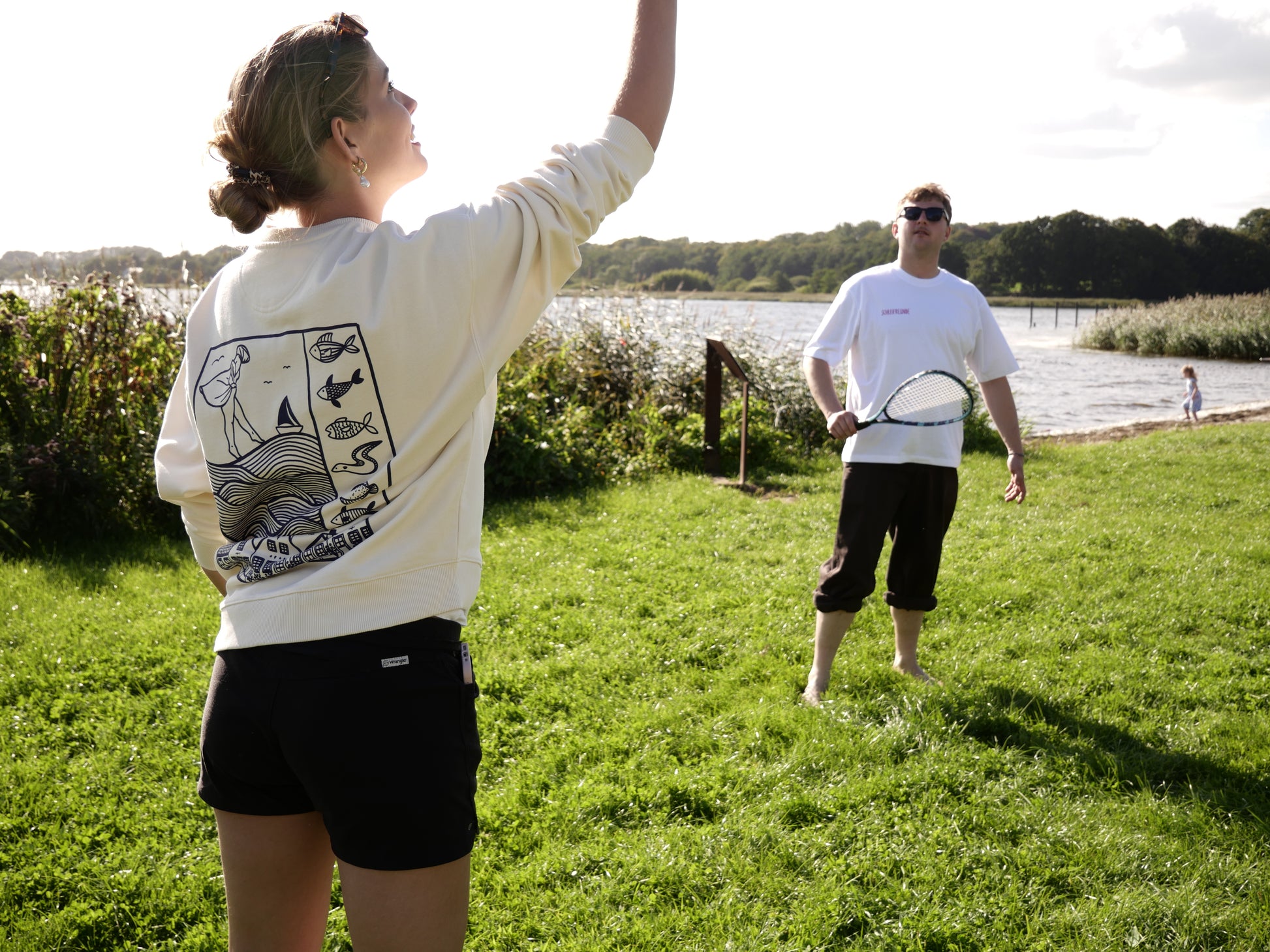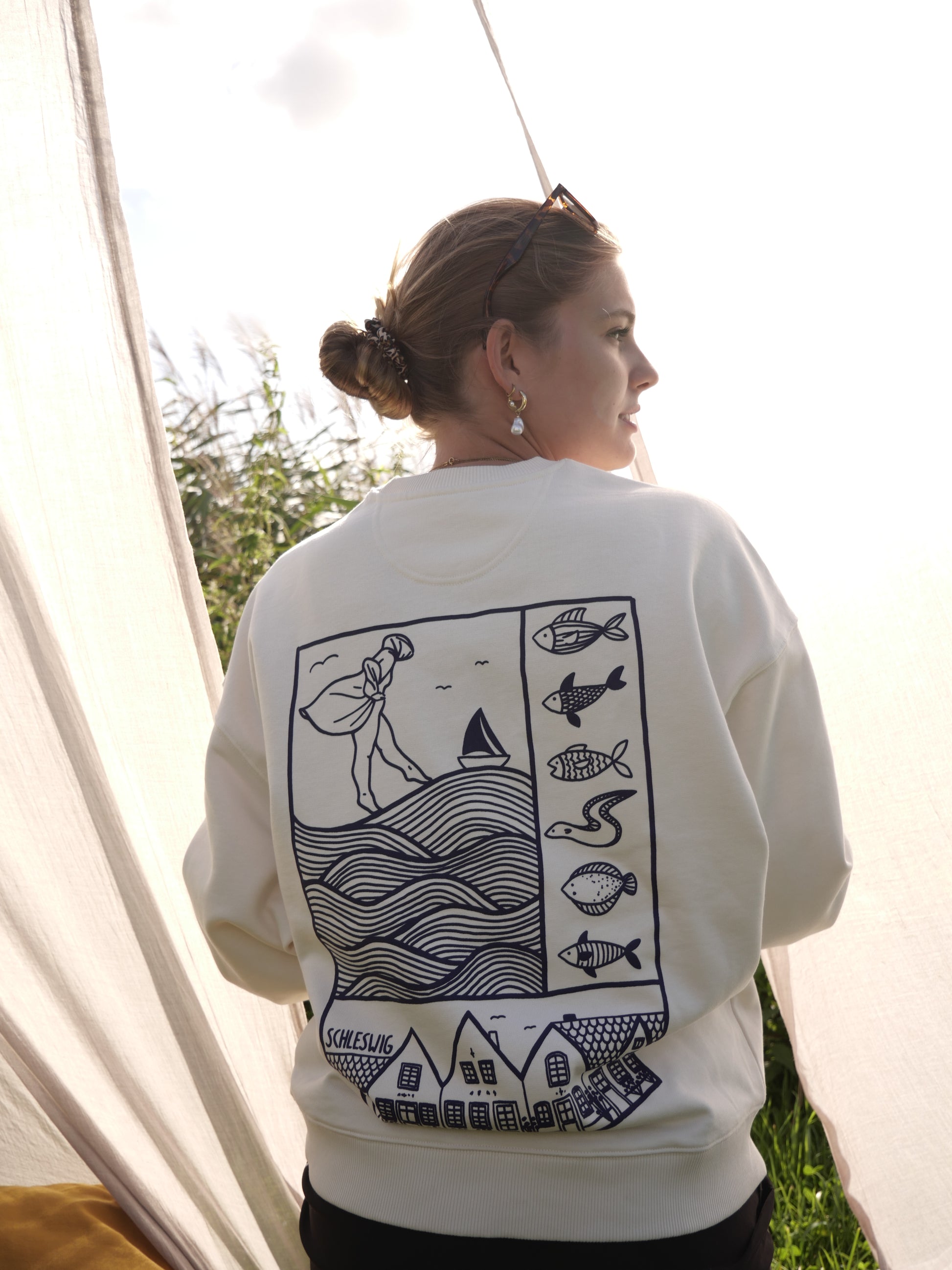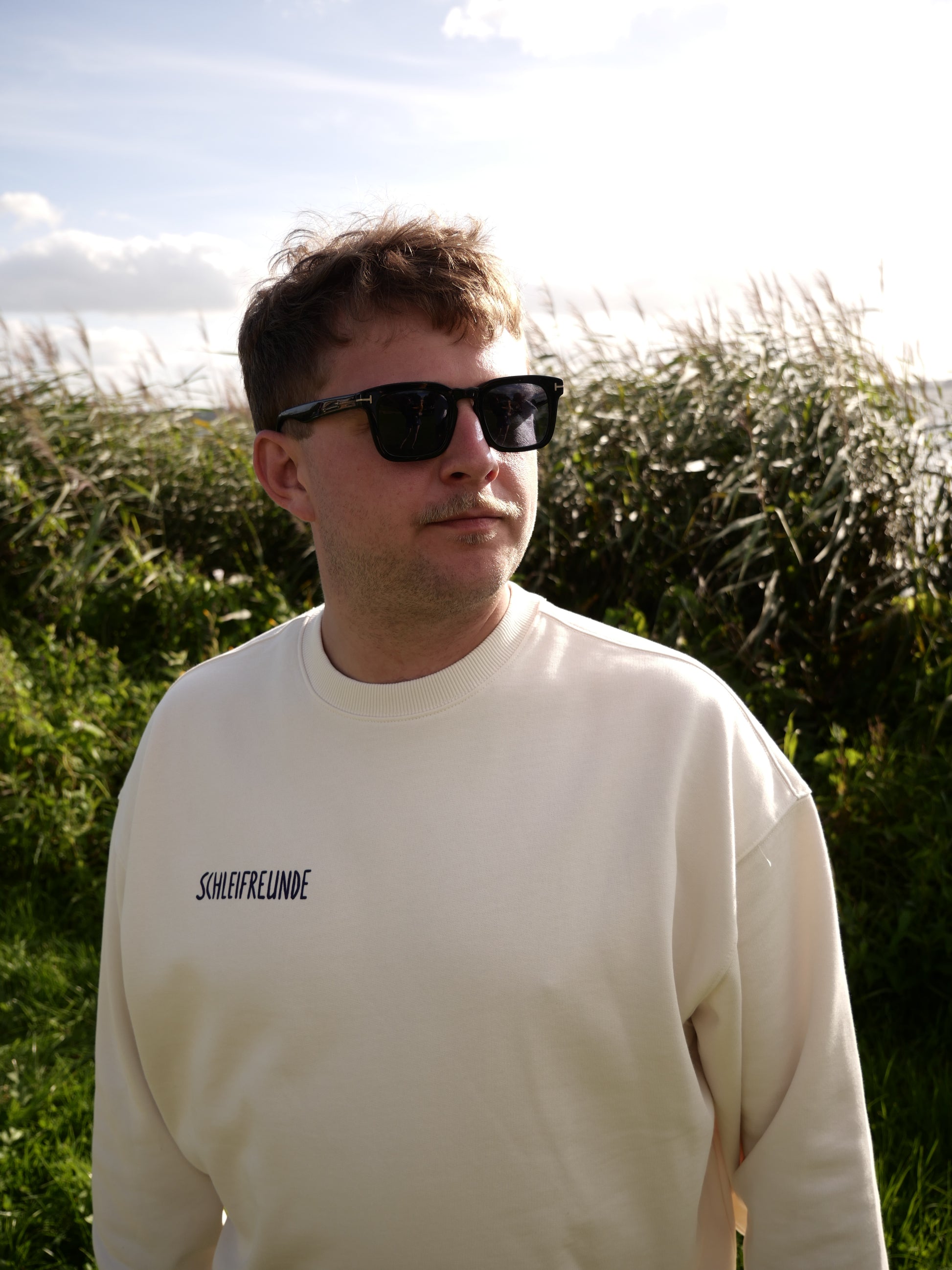Das Sweatshirt in Cream präsentiert den Schleifreunde-Schriftzug auf der Vorderseite und das Schleswig-Motiv als Backprint in Dunkelblau. Das unisex Oversize-Sweatshirt besteht zu 100 % aus gekämmter, ringgesponnener Bio-Baumwolle und garantiert so eine bequeme Passform sowie einen klassischen Rundhalsausschnitt. Mit einem Flächengewicht von 350 g/m² bietet das aufgeraute Material einen festen Griff bei gleichzeitig hohem Tragekomfort.