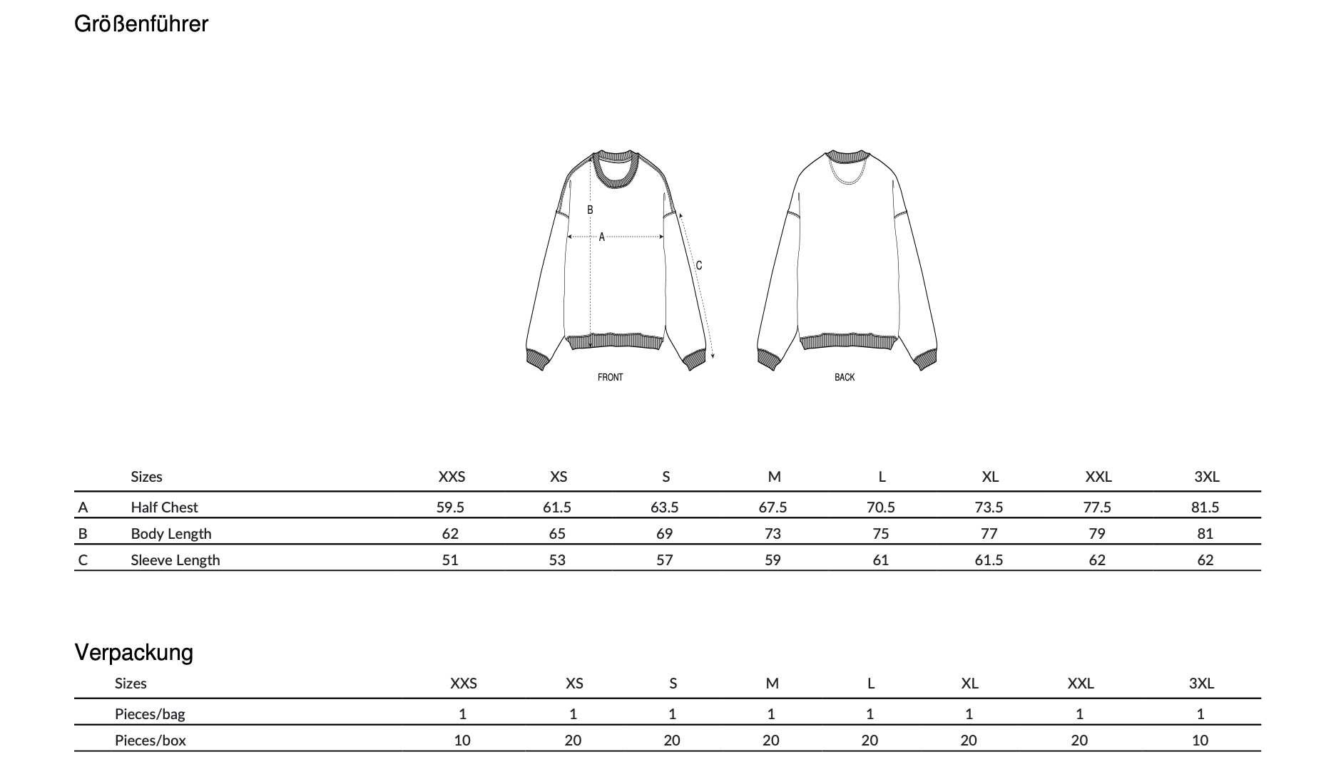 Passform-Hinweis: Unsere Artikel sind bewusst großzügig geschnitten und haben einen Oversized-Fit. Falls Du eine engere Passform bevorzugst, empfehlen wir, eine Größe kleiner zu wählen.