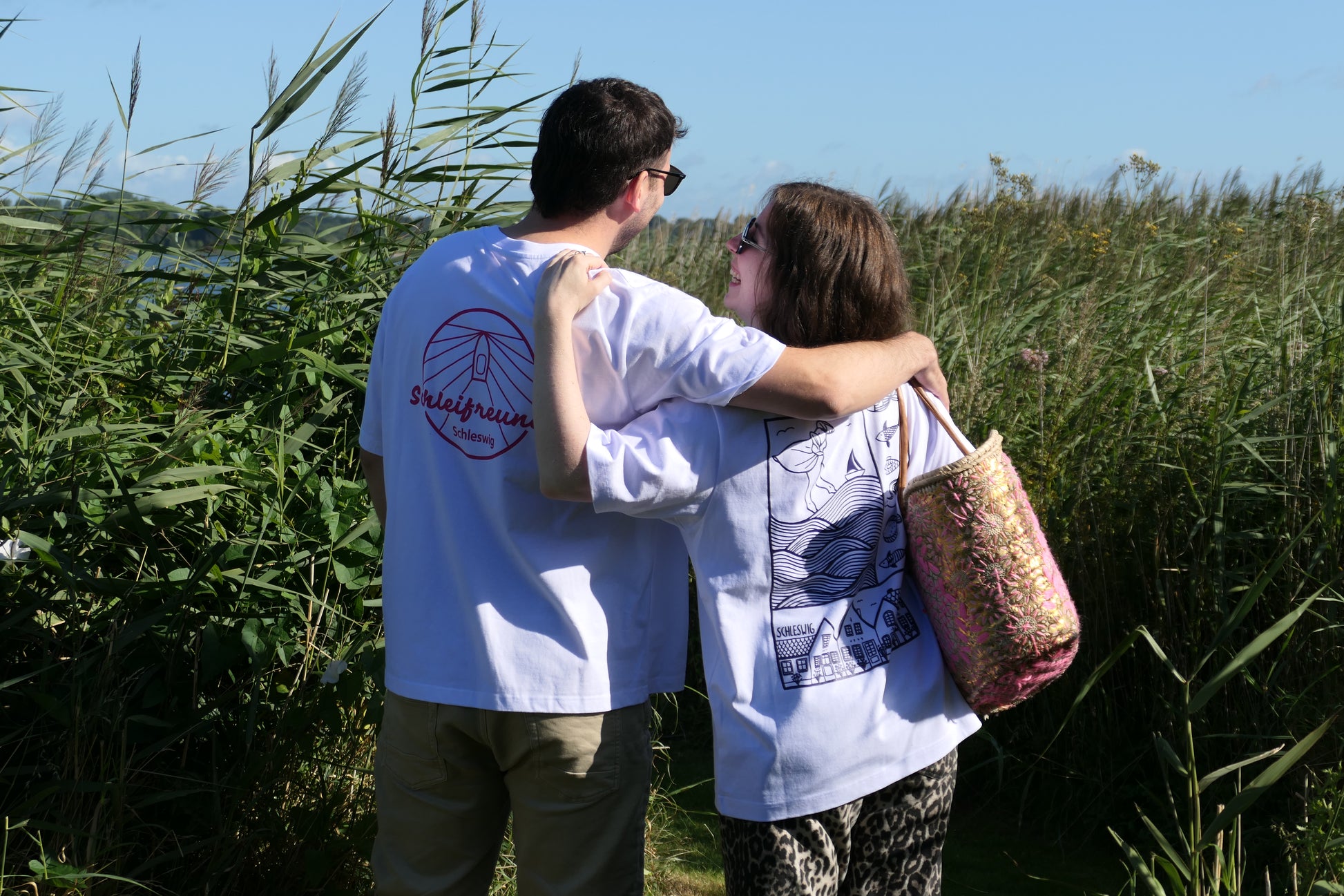 Das weiße Unisex T-Shirt präsentiert auf der Vorderseite den Schleifreunde-Schriftzug, die Rückseite schmückt das Schleswig-Motiv in dunkelblau. Das Modell besteht aus dichtem, schwerem Stoff und ist aus 100 % Bio-Baumwolle gefertigt, was eine nachhaltige Produktion gewährleistet. Mit seinem Oversized-Schnitt, dem klassischen Rundhalsausschnitt und den weit geschnittenen Ärmeln bietet es hohen Tragekomfort. Das Singlejersey-Gewebe mit 240 g/m² sorgt für eine feste Haptik und macht das Shirt besonders robust und langlebig.